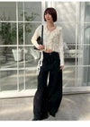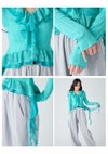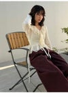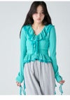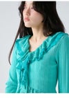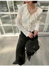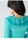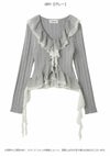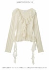 【透かし編み×シフォンフリルが華やぐヴィンテージライクトップス】 ヴィンテージ感のある透かし編み柄に、 シフォン素材のボリュームフリルを合わせた華やかな1着。 たっぷりのフリルで存在感を持たせつつ、 Vネックデザインで顔まわりをすっきりと見せ、バランス良く仕上げています。 前身頃の中心を引き上げたデザインによりウエスト位置が高く見え、 さり気なくスタイルアップを叶えるのも魅力。 身体にほどよくフィットするシルエットで、 パンツにもスカートにも合わせやすい万能アイテムです。 【Fabric】 表情豊かな透かし編みニットに、軽やかなシフォンフリルを組み合わせました。