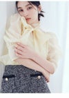 【艶感とモードを両立する定番オーガンザブラウス】 毎シーズン人気の「LILY BROWN」定番オーガンザブラウスがアップデートして登場。 シルエットはそのままに、今季はドレープ感のあるスリーブで大人フェミニンな印象に仕上げました。 取り外し可能なボウタイ付きで、フォーマルからデイリーまで幅広く活躍。 裾はタックイン・アウトどちらもきれいに見える計算されたシルエットです。