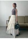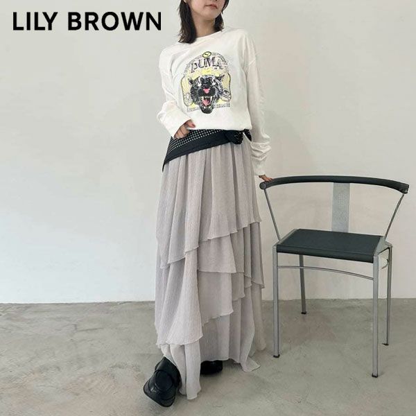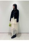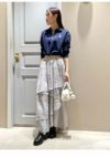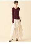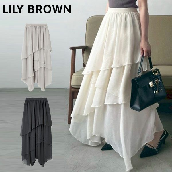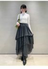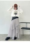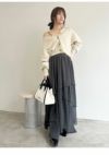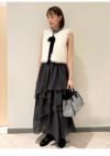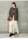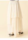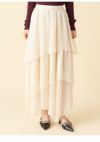 【ラメがきらめくエアリーティアードスカート】 軽やかなエアリー感と華やかなボリュームが魅力のティアードスカート。 歩くたびにふんわりと揺れるシルエットで、フェミニンムードを高めてくれる1枚です。 バックウエストはゴム仕様になっており、見た目の華やかさとは裏腹にストレスフリーな穿き心地もポイント。 軽やかな素材感でロングシーズン着回しやすいアイテムです。 繊細なラメを散りばめたシアー感のあるシフォン楊柳素材を使用しました。