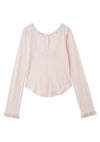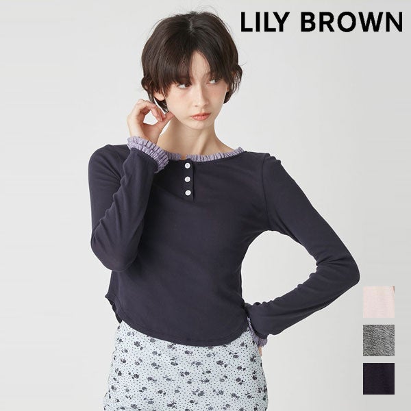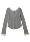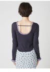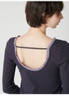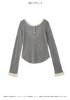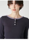 【レースが引き立つ大胆バックオープンヘンリーネックトップス】 背中を大胆に開けたデザインが目を引くヘンリーネックカットソー。 薄手のテレコ素材を使用し、軽やかでフィット感のある着心地に仕上げました。 カジュアルになりがちなカットソーを、 衿ぐりと袖口にレーステープを施すことで、フェミニンなムードへと昇華。 ワイドパンツやフレアスカートなど、幅広いアイテムと相性がよく、 デイリーからちょっとしたお出かけスタイルまで活躍する一枚です。 【Fabric】 柔らかく伸縮性のある薄手のテレコ素材を採用。 身体にしなやかに寄り添いながらも軽やかに着用でき、 バックオープンのデザインを美しく引き立てます。