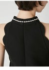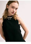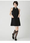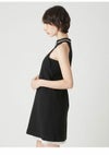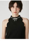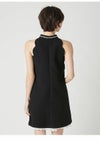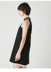 【リボンビジューが揺れるスカラップミニワンピース】 首元で揺れるリボンビジューが華やかなアクセントになるミニワンピース。 見頃と同じ生地で施したスカラップをアメリカンスリーブデザインに落とし込み、上品で女性らしいムードを引き立てます。 ほどよく体から離れるAラインシルエットが、スタイルを美しく見せてくれるのも魅力。 裾はシフォンプリーツ素材と裏地をドッキングし、軽やかなレイヤード風デザインに仕上げました。 1枚で主役になる特別感のあるアイテムです。