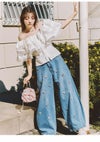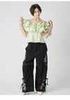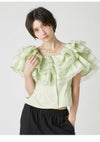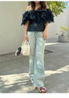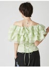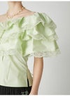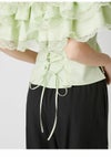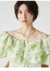 【大胆なボリュームが魅力のレースアップフリルトップス】 大胆なボリュームが視線を集めるフリルトップス。 フリル端には繊細なレーステープをあしらい、 華やかな中にも上品さを感じるデザインに仕上げました。 内側にゴムを施しているため、オフショルとして着用したり、 片側だけ落としてワンショルにしたりとアレンジが可能。 さらに、後ろウエストはレースアップリボン仕様で、 ご自身のウエストに合わせて細かなサイズ調整ができます。 主役級の存在感ながら、着こなしの幅も広い一着です。 【Fabric】 ハリのあるコットン素材を使用し、 フリルの立体感をしっかりキープ。 軽やかで快適な肌触りで、シーズンを通して着用しやすい素材です。