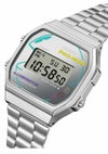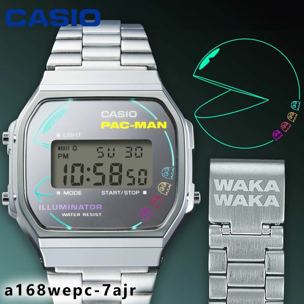 CASIO CLASSICとバンダイナムコエンターテインメントの人気ゲーム、「PAC-MAN」のコラボレーションモデルです。 50周年を迎えたカシオウオッチと2025年に45周年を迎えるパックマンのスペシャルコラボレーション。 パックマンの世界観を遊び心満載のデザインで表現しました。 シルバーの蒸着文字板にパックマンと4種類のゴースト(ブリンキー、インキー、クライド、ピンキー)を大胆にレイアウト。 カラフルなネオンカラーでポップなデザインに仕上げました。 中留カバーとELバックライト点灯時には、パックマンがクッキーを食べる音「WAKAWAKA」の文字をあしらい遊び心をプラス。 裏蓋にはパックマンとロゴを刻印しました。ネオンカラーを施したスペシャルパッケージ付きです。 「PAC-MAN?& cBandai Namco Entertainment Inc.」