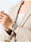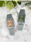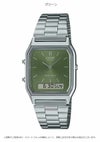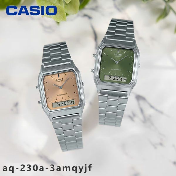 カラーダイアルを採用した華やかなデジタル・アナログコンビネーションモデルです。 ベースモデルは角型フェイスにアナログ時計とデジタル表示を組み合わせた人気のAQ-230。 旭光文字板に、深みのあるグリーンを採用したクラシカルなデザインです。 日常生活用防水やストップウオッチ、アラーム等、便利な機能も備えています。