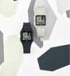 デジタル表示の中に液晶アナログ時刻と各機能に連動したグラフィックを採用したデジタルウオッチです。バンドの樹脂素材に再生可能な有機性資源を含むバイオマスプラスチックを使用しました。シンプルなデザインに飽きの来ないナチュラルカラーを採用したユニセックスサイズです。LEDバックライト、ストップウオッチ、時刻アラーム、タイマー、ワールドタイム等便利な機能も備えています。
