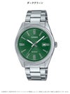 ダークグリーンのフェイスがシックな三針メタルアナログモデルです。 バーインデックスのシンプルなデザインで時刻も見やすく、 3時位置の小窓では日付が確認できます。