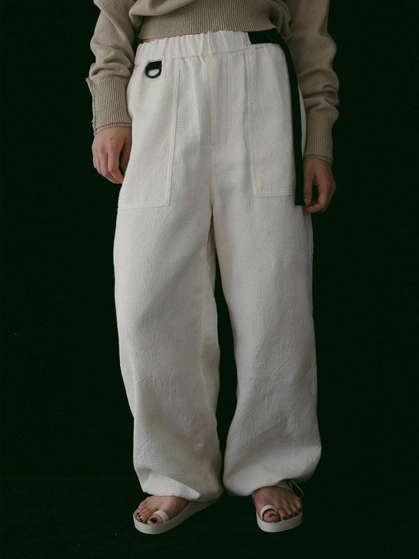 国内で織り上げたオリジナルのジャカード素材を使用したラフパンツ。
