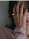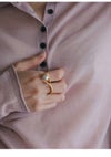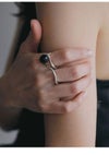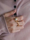 二つの指を繋ぐフォルムが印象的なダブルフィンガーリング。なだらかなカーブラインにボールモチーフを重ねた、構築的なデザインが目を引きます。シルバーにはブラック、ゴールドにはシルバーのボールを合わせたミックスカラー仕様。異なる質感のコントラストが、手元に程良い存在感を添えます。ひとつ着けるだけでも、ぐっと華やかな印象を演出します。