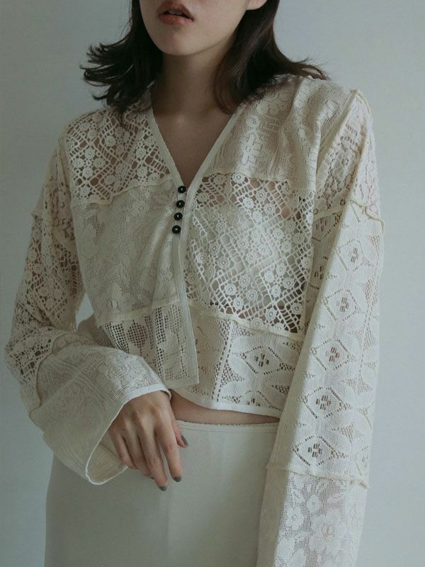 - 【WINTER SALE50%OFF】【即納】アンヌーク anuke トップス Patchwork Lace Cardigan パッチワークレスカーディガン 長袖 Vネック 62510403