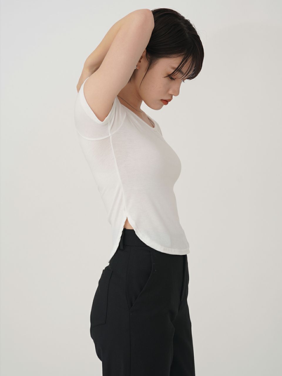 クロップドUネックTシャツは、シンプルで使いやすい一枚。