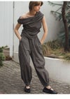 ・asymmetry tuck gather off shoulder check tops と