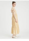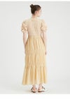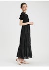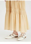 シャーリングゴム糸を使用してギャザーを寄せたトップスと、 程よいシアー感と光沢のあるスカートとのドッキングワンピース。 袖にもゴム糸を用いて立体的なぽこぽことした表面感を作り出しています。 カットソー生地に加えウエストにもぐるりとゴムを入れる事で、 体系問わずストレスフリーな着心地になっています。