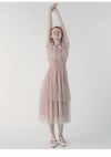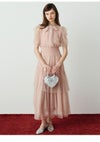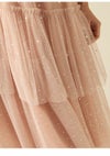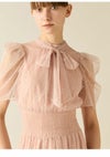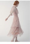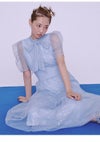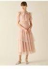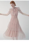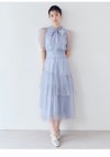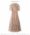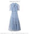 全体に散りばめられたラメが輝きを放ち、 ロマンティックムードを盛り上げるドレス。 ウエストシャーリングでメリハリのあるシルエットに。 前後どちらでも結べるボウタイが華やぎを添えるポイントとなっております。 結婚式やオケージョンシーンにもおすすめのアイテムです。