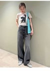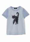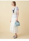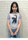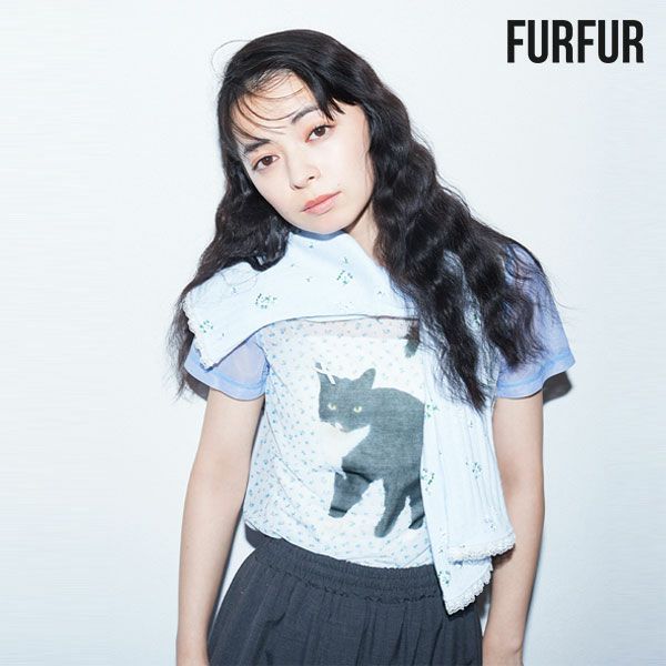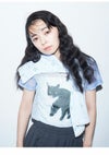 上國料萌衣さんとのコラボ第三弾。愛猫Oolongをモデルにした遊び心満載のアイテムです。 モード感のあるシアーなジャージー生地を使用し、前身頃にはクラシカルな小花柄とキリリとした表情のOolongをプリント。 しっぽには小さなリボンが施され、デザインに遊び心をプラスしました。 シンプルながらもユニークなタッチが魅力的で、コーディネートに個性を加える特別な一着です。