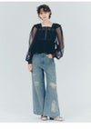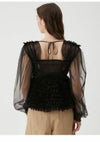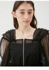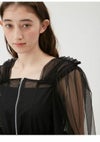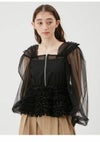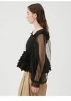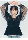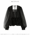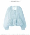 ペプラム部分にぎゅっと詰まったチュールフリルが特徴的なブラウス。 衿のリボンで肩幅の調節が可能で、ぎゅっと絞るとパフスリーブに、ゆるく結ぶとドロップショルダーになります。 お手持ちのトップスと合わせて裾からペプラムフリルを出すレイヤードもお勧めです。