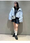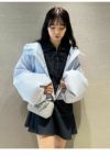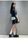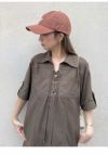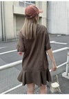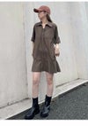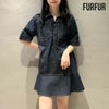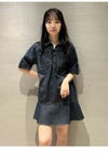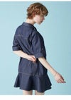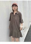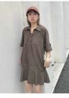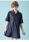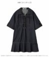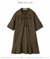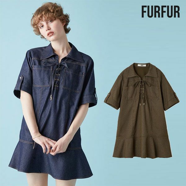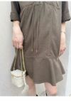 フロントの共生地で作られた紐がレースアップで付けられた、 スキッパー風の襟がポイントのミニワンピース。 色によって素材感が違うのでそれぞれ印象が異なってきます。 ボディは少しワイドなストレートラインで、 裾にフレアが入ったペプラムパーツがついているのでフェミニンな印象。 タイツにロングブーツ合わせで1枚での着用がお勧めです。