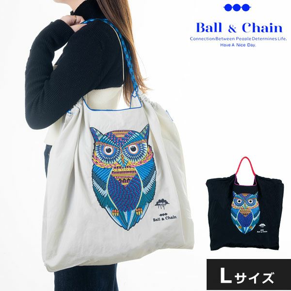 サン ヒデアキ ミハラのデザイナー三原英詳によるショッピングバッグBall&ChainアーティストRyuAmbeとのコラボレーション。しっかりとしたポリエステル素材のバッグ。ハリと厚みのある素材で軽さと安定感があります。手のひらサイズに折りたため、取り出し口に付属のゴムで簡単にまとめられます。エコバッグとして、荷物が増えた時のサブバッグとして便利に持ち歩けます。ちょっとした買い物はもちろん、プレゼントとしてもおすすめ。持ち手を片側に引き出すとショルダーバッグとして使用できます。
