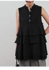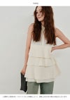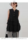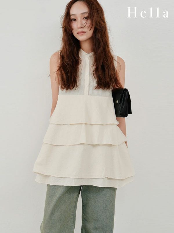 立体感あるティアードフリルが目を惹く、夏らしいブラウス。 甘くなりがちなフリルデザインも、スタンドカラーや比翼仕立てで品よく仕上げました。 素材は軽やかで、さらりとした肌あたり。盛夏にも涼しく着られる質感です。 やや長めの丈感と広がりのあるフレアシルエットで、自然とスタイルアップが叶います。