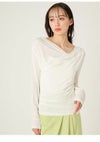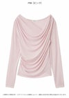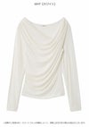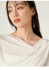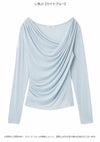 【オフショルとしても使える優美なタックドレープトップス】 構築的なタックから生まれる流れるようなドレープが美しいカットソー。 アシンメトリーなデザインがシンプルながらもモードな存在感を発揮します。 程よい開き具合いのネックラインはオフショルとしても使える2WAYで、センシュアルなムードをプラス。 胸元はパカパカと浮いたりしないバランスに調整し、安心感のある着心地を叶えました。 素材にはしなやかさとフィット感を兼ね備えたレーヨン混フライスを使用。 体のラインを拾いすぎず柔らかなフィット感です。 袖はやや長く設定して手元にニュアンスを加えました。 デニムなどベーシックなボトムに合わせるだけでもサマになり、シーンレスで活躍します。 色展開は、WHT、PNK、LBLU、TUQの充実したラインナップ。