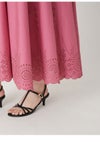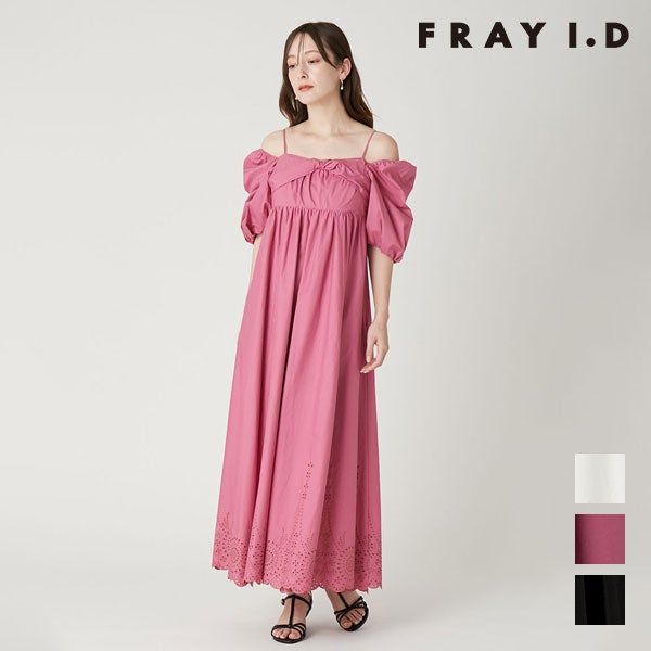 【3WAYの袖デザインが楽しめる刺繍ワンピースはシーン問わず活躍】 裾にFRAY I.Dオリジナルの繊細な刺繍を施したワンピースは、 袖のデザインを変えて楽しめる3WAY。 フェミニンなパフスリーブ、センシュアルなオフショルダー、 袖を外してキャミワンピと、表情を変えて長く着用していただけます。 胸元にはツイストリボンをあしらい華やかなアクセントに。 素材は、軽やかな高密度のコットンを使用。 ややハリのある風合いがボリュームシルエットを引き立て、 存在感たっぷりに着映えします。 デイリーからリゾートまでさまざまシーンにフィット。 色展開は全3色。春らしいピュアなWHT、 リゾートや夏まで映える鮮やかなPNK、 バイカラーの刺繍がモードで大人なBLKをご用意しました。