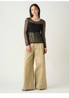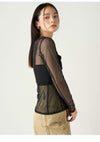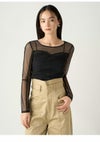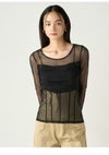 【ビスチェライクなディテールで個性を加えたシアーチュールトップス】 トレンド感のあるシアーチュールカットソーに、ビスチェ風の切り替えを施してさらに感度高く。 程よいフィット感があるので、レイヤードスタイルなどもすっきり決まります。 ボディラインをきれいに見せてくれるのもうれしい。 また、アクセントとしてバックスタイルにロゴプレートをあしらいました。 インナーを仕込んで一枚で着たり、ジャケットとのレイヤードやニット合わせなどスタイリングの幅が拾いアイテムです。 GRYとBLKの使いやすい2色を揃えました。