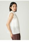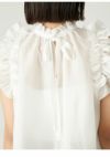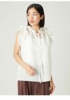 【フリルが腕まわりもさりげなくカバー。2wayでも着られる、遊び心たっぷりのシルキーなブラウス】 シルキーな光沢感が上品な、シアータフタを使用した大人のためのブラウスです。 襟と袖ぐりに施したギャザーフリルは、華やかさをプラスしてくれつつ、気になる二の腕まわりをカバーしてくれます。 首元にはレーヨングログランリボンをプラスしていて、リボンをフロントにしてもバックにしても、どちらでも着用可能な2wayの仕様。 またリボンを結ばず垂らして着ると、スキッパー風のデザインになって、抜け感のあるスタイルになります。 ふんわりと広がる裾は、ボトムにタックインしてブラウジングして着こなすのも◎。