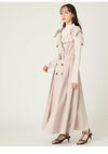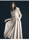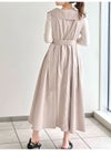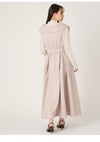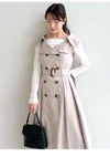 【レディ気分が盛り上がるトレンチディテールワンピで上品に】 トレンチコートのディテールをドレスライクに落とし込んだ、モードなワンピース。 抜け感を演出する広めのラペルやダブルボタンデザインがクラシカルかつレディなムード。 共布ベルトでウエストマークをすると、構築的なシルエットがさらに際立ちメリハリのあるバランスに。 ドラマティックに映えるとともに、スタイルアップを叶えてくれます。 素材はハリと落ち感を併せ持つリッチな風合い。 動くたびに美しい揺れを生み出し、印象的な佇まいへと誘います。 歩いたときに脚が見えすぎないように、スカート部分は膝辺りまで縫い合わせて足捌きをフォローしつつも品よく。 一枚ではもちろん、インナーにリブニットやシアーニットを合わせるスタイリングもおすすめです。