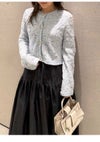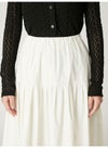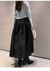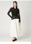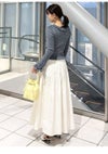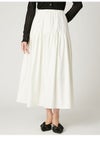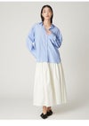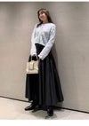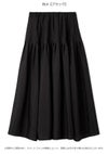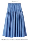 【エアリーに広がるタックフレアスカートがきれいめモードな印象】 たっぷりシルエットがドラティックなフレアスカート。 ウエスト部分のイレギュラータックは、 複雑に折りたたんだ小技の効いたデザイン。 程よくメリハリのある構築的なシルエットをキープしつつ、 気になるウエスト周りをカバーする効果も。 光沢感とハリのある風合いも手伝って、モダンな印象へと導いてくれます。 適度なストレッチ感とウエストぐるりゴムで履き心地もしっかりフォロー。 色展開は全3色。 チンツ加工のタイプライター素材を使用したIVRとBLU。 シルキーでリッチ感のあるBLKをご用意しました。