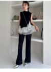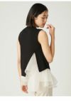 【スリットからこぼれるラッフルが華やか。シンプルなニットに、フリルのインナーを合わせた2枚セット】 華やかなラッフルフリルを施したインナーと、シルク混のニットを組み合わせて完成するセットアイテムです。 ニットは、ビスコースのなめらかさとシルク混のさらりとした感触が特徴で、スリットを効かせたミニマムなデザイン。 インナーは、たっぷりのラッフルフリルにマットオーガンジーを使用して、上品な印象に仕上げたキャミソール型です。 ニットのスリットから広がるラッフルがフェミニンなニュアンスで、コーディネートが華やぐ1枚です。 すっきりした美脚系パンツや、ゆったりとしたワイドパンツとの相性も抜群です。 カラーは4色をご用意。上品な限定カラーのBEG、差し色になるYEL、シックなGRY、モード感のあるBLKで展開しています。