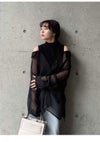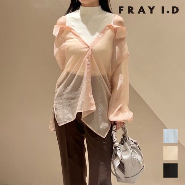 【FRAY I.Dの名品・セミシアーシャツレイヤードニットが今季も登場】 FRAY I.Dの人気アイテム・シャツレイヤードニットがリバイバル。 モックネックのノースリーブニットに、 セミシアーのオーガンジーシャツを組み合わせた、 旬な重ね着を簡単に楽しめる技ありデザイン。 ニットのアームホールにシャツを止めるボタンをセットすることで、 肩がのぞく絶妙なバランスをキープしています。 それぞれ単品でも使えるので、 幅広いシーンでフレキシブルに活躍してくれます。 シャツは、透けすぎず、光りすぎず、 そしてナチュラルなシワ感で表情を加えたオーガンジー素材をセレクト。 バックスタイルには華奢なリボンをあしらってフェミニンなアクセントを加えました。 色展開は全3色で、清涼感のあるバイカラーでお作りしたLBLU、 シーズンムードが高まるORG、モードなBLKをご用意しています。