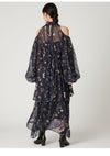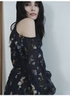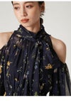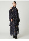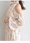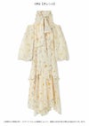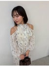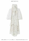 【水彩風の花柄が華やかなオフショルワンピースで春を呼び込んで】 水彩画のような淡いタッチが春らしいFRAY I.Dオリジナルの花柄プリントを、 ラメ入りのシフォン素材に乗せたワンピース。 たっぷりとギャザーを寄せたパフスリーブの肩回りにはカッティングを入れて、 軽やかな肌見せデザインに仕上げました。 ヘルシーかつ上品に楽しめるように、 ボウタイ付きのハイネックで肩以外の肌感は控えめにしてバランスよく。 ボウタイは、前後どちらでも結べる2WAYなのもうれしいポイントです。 スカート部分は、動くたびにふわりと揺れる軽やかなティアードデザインを採用。 高め位置で切り替えることでスタイルアップも叶えました。 サイドに付けた共布リボンでフィット感の微調整を行なうと、 さらにきれいなシルエットでお楽しみいただけます。 一枚ではもちろん、ジャケットなどをレイヤードする着こなしもおすすめ。 グレー調プリントでモダンにまとめたWHT、季節感が高まるORG、 カラフルな花柄が目を引くNVYの3色でお作りしました。 同素材でスカート(FWFS261202)のお作りもございます。