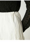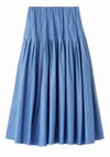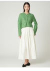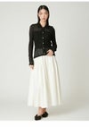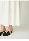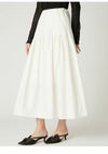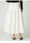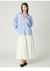 【エアリーに広がるタックフレアスカートがきれいめモードな印象】 たっぷりシルエットがドラティックなフレアスカート。 ウエスト部分のイレギュラータックは、 複雑に折りたたんだ小技の効いたデザイン。 程よくメリハリのある構築的なシルエットをキープしつつ、 気になるウエスト周りをカバーする効果も。 光沢感とハリのある風合いも手伝って、モダンな印象へと導いてくれます。 適度なストレッチ感とウエストぐるりゴムで履き心地もしっかりフォロー。 色展開は全3色。 チンツ加工のタイプライター素材を使用したIVRとBLU。 シルキーでリッチ感のあるBLKをご用意しました。