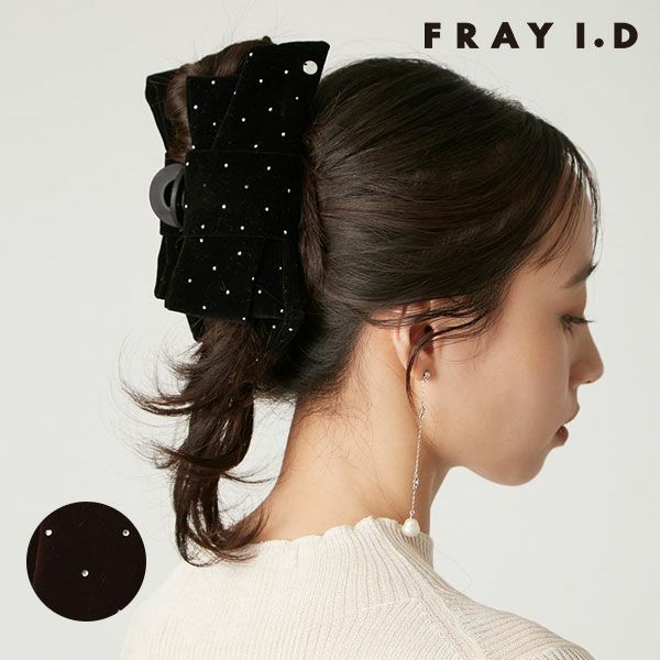 【メタルストーンが煌めく、モードな甘さのリボンヘアクリップ】 FRAY I.D15周年を記念したリボンをテーマにしたカプセルコレクションより、待望のオリジナルデザインのヘアクリップが登場。 FRAY I.Dのアイコンバッグ「ルエル」のリボンモチーフを、そのまま落とし込んだスペシャルデザインです。 構築的なフォルムのビッグリボンは、どこから見ても素敵に映えるバランスに設計。 また、上品なベロア素材をベースに小粒のメタルストーンを散りばめて、リュクスなムードに。 ヘアクリップとしてだけでなく、バッグやポーチにチャーム感覚で付けたくなるような華やかなデザインを目指しました。 同シリーズのバッグとリンクさせても◎。 色展開は、BRWとBLKのシックな2色からお選びいただけます。 ※右下に丸いネームプレートが付く仕様に変更となります。