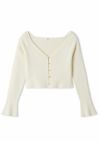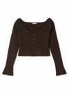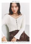 【さりげないデザインがサマになる、シンプル上品な短丈カーデ】 シンプルなクロップド丈のリブカーディガンは、着回しやすさをキープしつつ素敵に映えるディテールにこだわった一着。 デコルテが美しく映える天幅広めのネックラインや、袖口のフレアデザインがどこかモードな印象。 フロントに並んだ半球体のゴールドボタンも洒落たアクセントを加えます。 モダンな印象をさらに高めるのは、なめらかで品が香る表面感。 とろみがあるレーヨンと丈夫で扱いやすいコットンをMIXし、気持ちいい肌触りや、吸湿性・通気性に優れた糸にしました。 細いリブに編み上げることで程よいフィット感が生まれ、ボディラインもきれいに見せてくれます。 今シーズンは、特にワンピース合わせがおすすめ。 ラフに羽織っても、ボタンを留めてプルオーバー風に着てもおしゃれにまとまります。 カラー展開は、4色。ベーシックに使えるWHT、差し色として活躍するRED、シックで上品なBRW、モードなBLKがラインナップ。