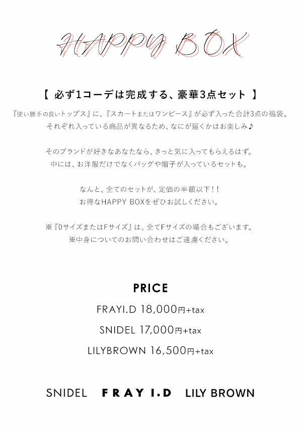 他の画像を見る 数量限定!人気ブランドの福袋販売決定! 【福袋】【即納】 HAPPY BOX 当店限定 SNIDEL FRAY I.D LILY BROWN スナイデル フレイアイディー リリーブラウン ハッピーボックス 半額以下 お得 セット 3点セット happybox2024 即納 ¥ 18,700 税込 詳細を見る お気に入りに登録する