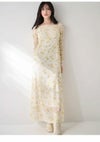【ロマンティックな春気分を先取りできる軽やかフロッキープリントギャザーロングワンピース】 伸縮性と程よい透け感のあるフロッキーチュールにプリントを施した、ロマンティックなロングワンピースが届きました。 軽やかなチュールに起毛感のあるフロッキー加工を加えて表面感を出しているので、肌寒い季節にもぴったりのアイテム。 ロングシーズンご着用いただけます。タイトなシルエットですが、 前後身頃や、袖にギャザーをたっぷり入れてドレッシーに仕上げ、切り替えを入れてボディラインに添いながらも、 程よく拾いすぎないシルエットで、着用しやすくお作りしています。後ウエストに紐がついているのでウエストを絞ることもできます。 スカート部分は生地のオチ感を活かしたナローシルエットでエレガントに。 伸縮性のある生地なので、被りでご着用いただけます。肩はオフショルにも出来るデザインで、シーンに合わせてアレンジいただけます。裏地付きです。