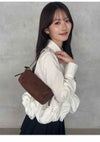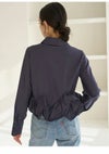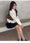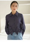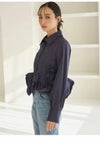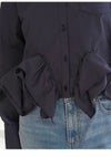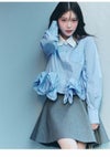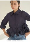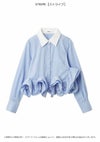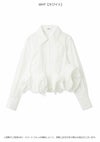 【裾の立体的なラッフルフリルディテールがアクセントのシャツ】 クロップド丈のクラシカルなシャツの裾にボリューミーなラッフルディテールを プラスした主役級アイテムです。 裾のフリルはアシンメトリーでモードに仕上げているのもポイント。 2重フリルのボリューム感と幅と位置にもこだわり、 エレガントで着心地良く仕上げています。 ボリュームのある裾に対して身頃はコンパクトなシルエットですっきりとしているので、 パンツスタイルにも、スカートスタイルにも合わせやすいデザインで着回し力も抜群です。 ややハリ感のあるシャツ生地を使用しました。 袖口はカフスで華やかさをプラスしています。 胸元にはワンポイントにポケットをあしらっています。 【Fabric】 ホワイトはワンカラーで仕上げています。 ストライプはブルーベースのピンストライプシャツで ホワイト襟を合わせて爽やかに仕上げています。 裾のフリルにはワイヤーを入れて形をキープしています。