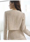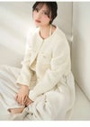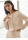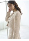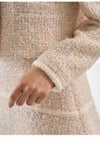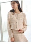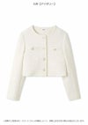 【キラキラ艶めく春カラーツイードジャケットをコーディネートの主役に】 ふわふわキラキラとした華やかなオリジナルファンシーヤーンでお作りした、大人の甘さが魅力のツイードジャケットが届きました。 春気分を先取りできる爽やかなカラーが目をひくアイテムです。端のブレードテープや、 フロントの貝調ボタンが今季らしいクラシカルなデザイン。少し着丈が短めで、 ボリュームのあるボトムスとも合わせやすく、今季らしいバランスが手に入ります。 少しハイウエストでお作りしたツイードフレアミニスカート(SWFS261044)と同素材を使用しており、セットアップでのご着用もおすすめです。 裏地付き。サイドにポケットが付いています。胸元のポケットはデザインです。