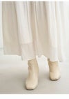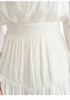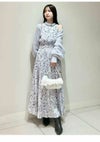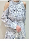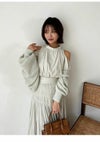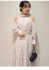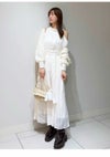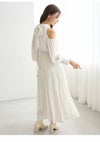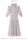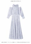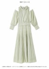 【軽やかで優美な動きを生み出す、人気のコールドショルダーロングワンピース】 たっぷり柔らかなギャザーが生み出すふんわり感と、 カットスリーブで肩先に抜け感を出したシルエットで軽やかな魅力を加えたコールドショルダーロングワンピースが届きました。 柔らかなドレープのややハイネックデザインで後ろ側にはロングテールリボンを配置しバックシャンに。 袖口はカフスできちんと感を出し、エレガントに仕上げました。 割繊生地のソフト感を活かしたシルエットですが、後ろのウエストマーク位置にはゴムシャーリングを加えてシルエットにメリハリを出し、 ヒップ位置にかけては細やかなプリーツですっきりとさせ、スタイルアップ効果も期待できます。 ゆるっと羽織れるニットボレロカーデ(SWNT261055)とコーディネート色でお作りしており、セットでのご着用がおすすめです。後ろファスナーで着脱いただけます。