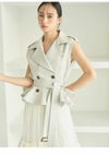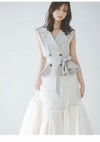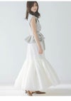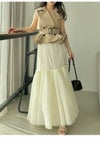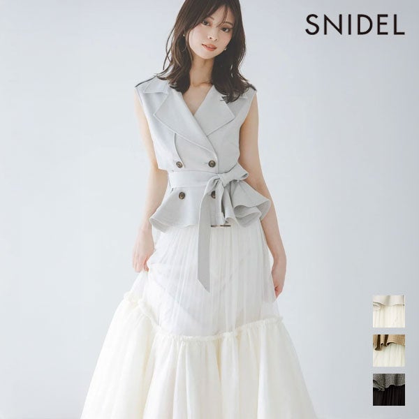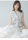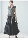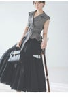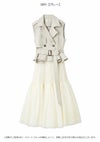 【クラシカルなノースリトレンチトップスとゴージャスなチュールスカートのセットアイテム】 クラシカルなトレンチ型ノースリトップスと、 シアー感の美しいボリューミーなチュールスカートを組み合わせた トレンド感満載なレディなセットアイテムが届きました。 トップスはトレンチディテールをたっぷりと詰め込み、 裾はペプラムシルエットでレディな仕上がりに。 共布のベルトでウエストマークをすればスタイルアップ効果も抜群です。 ベルトは取り外し可能なので、 お手持ちのベルトに変えて雰囲気も変えられます。 脇にマチを入れてインナーを見えにくく仕上げました。 裏地付きで、サイドのファスナーで着脱いただけるデザインです。 上下セットで着用すれば、まるでドレスのようなスタイリングが完成します。 特別なシーンにもお出かけにも、幅広く対応。 トップスはデニムやワイドパンツに合わせたり、 スカートはニットやブラウスと合わせたり、着回し力も抜群。 単品使いでも着こなしの幅が広がるのが魅力です。 【Fabric】 グレー、ベージュ、ミックスの3色展開。 グレーとベージュはアイボリーのスカートを合わせています。 ミックスはブラックホワイトの細やかな千鳥柄のトレンチトップスに ブラックのスカートを合わせています。