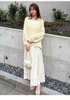 【風合いのあるざっくりスラブニットとレディなキャミソールワンピースのセット】 ナチュラルな風合いのスラブニットとシルクライクな 生地のキャミソールワンピースとのセットアイテムが到着。 春気分を盛り上げる、今季らしいまろやかな色味で展開しています。 凸凹とした表面感のスラブ糸を使用したゆったりとしたローゲージニットは、 深めのV開きで抜け感をプラス。肩を落としたコケットな着こなしもおすすめ。 ロング丈のエレガントなキャミソールワンピースは、 程よい光沢感のある軽やかな生地で裾に向かって流れるようなラインを演出。 高めのウエスト位置切り替えで美脚効果も抜群です。 ショルダーストラップはリボンの長さで調節いただけるデザインです。 ワンピースは裏地付き。被りでご着用いただけます。 シンプルなデザインで、それぞれ単品でも活躍するアイテムです。 【Fabric】 アイボリー、イエロー、ラベンダーの3色展開です。