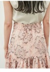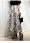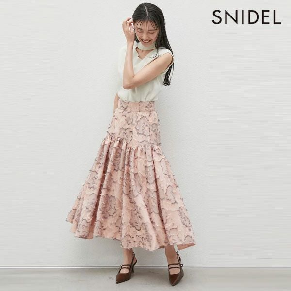 【程よいフリンジ風生地がエレガントでモードな印象のフラワージャガードテールスカート】 繊細なフラワーモチーフで、立体感のあるジャガード生地でお作りした、 ドラマティックなボリュームスカートがお目見え。 生地はSNIDELオリジナルでお作りしています。 ウエスト周りはスッキリとさせ、ティアードで裾に向かってボリュームを出し、 美シルエットに仕上げました。 ヒップ下からエレガントにフレアが広がる1着です。 カジュアルにもドレスアップにも活躍します。 背中側はゴムシャーリングで着心地良く仕上げました。 サイドのファスナーで着脱いただけます。