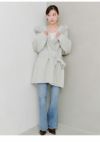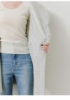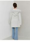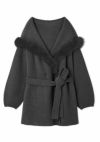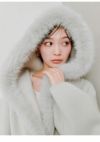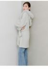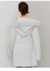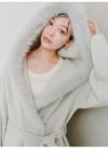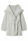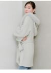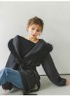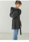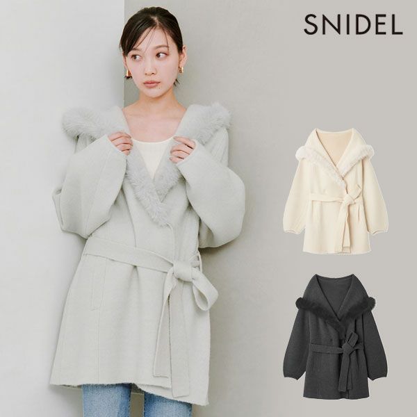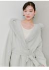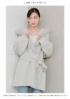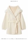 【たっぷりフードとフェイクファーが華やかなキレイめニットコート】 ふっくらと目の細やかな編み地でやわらかな印象に仕上げたニットコートがお目見え。 デコルテ周りを華奢見えさせる、たっぷりと大きめなフードでボリューミーに仕上げました。 フードにはふんわりゴージャスなフェイクファーをあしらい華やかに。 ウエストリボンがついており結び方でシルエットをご調節いただけます。 袖は丸みを出し、女性らしく仕上げました。コートとしてはもちろん、チュニック丈なので、ミニボトムスと合わせてワンピースのようにもご着用いただけます。 左右にポケット付きです。フロントの内側にボタンを2つ配置して留めることができますが、外側からは見えないのですっきりとしています。