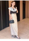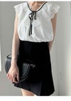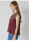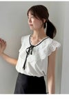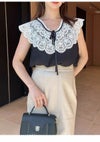 【オリジナルロマンティックレース襟が上品華やかなノースリブラウス】 オリジナルでお作りしたロマンティックなエンブロイダリーレース襟が目を惹くブラウスです。 滑らかでとろみ感のあるノースリブラウスに、程よくハリ感のある肩まで覆う大きな刺繍レースをドッキングしており、 顔まわりを明るく演出。スタイリングにモード感をプラスします。 胸元にはリボンを添えてエレガントに。キレイめパンツに合わせたモードな着こなしや、 デニムでカジュアルダウンさせた着こなしなど、シンプルなデザインなので様々なボトムスに合わせやすく、 スタイリングの幅が広がります。裏地付きです。