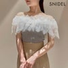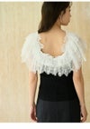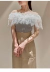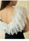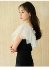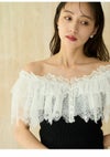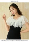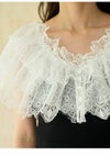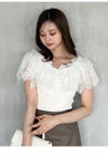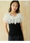 襟ぐりに華奢なレースたっぷりとレイヤードしており、1枚で顔周りを華やかに演出。