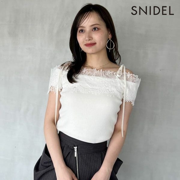 【定番人気のレーストリミングニットプルオーバーに半袖バージョンが登場】 襟ぐりに太幅のゴージャスなレーストリミングを施した、 SNIDELで定番人気のレーストリミングニットプルオーバーの半袖バージョンが登場。 ニット袖部分にも太幅レースを使用しているので、 レースの透け感がスタイリングを軽やかに演出します。 顔周りに華やぎをプラスする、長めの肩紐リボンが付いているので安心。 クリーンなニット生地を使用し、程よくふんわりとしたシルエットで着やすく仕上げました。 カジュアルからキレイめスタイルまで幅広くご使用いただけます。