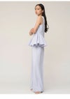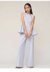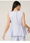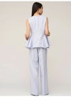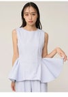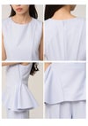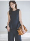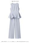 【シンプルエレガントなデザインで着回しも効くペプラムブラウスとワイドパンツのセットアップ】 ドライタッチで微ストレッチの効いたツイル生地を使用したペプラムデザインの ブラウスとワイドパンツの便利なセットアイテムが到着。 ノースリブラウスは腰高めの位置から脇にタックを入れてフレアを出したパターンで、 立体感のあるペプラムシルエットを作りました。 ウエストのラインが綺麗に見えるようにくびれの位置を高く設定。 立体的なシルエットになるようにタックやフレア分量もこだわってお作りしています。 トップスは後ろ側のコンシールファスナーで着脱可能。 程よくワイドシルエットのパンツはセンタープレスを入れてエレガントな仕上がりに。 サイドに便利なポケットも施しました。 お尻側のフェイクポケットはお尻位置を高く見せる効果も。 それぞれ単品使いもしやすいシンプルなアイテムで、 オンスタイルやオケージョンにもご使用いただけます。裏地付き。 【Fabric】 清楚で汎用性の高いアイボリー、春らしく爽やかな色味のサックスブルー、 今季トレンド感のあるネイビーの3色展開。