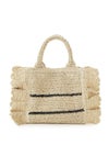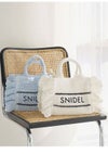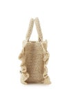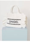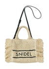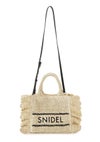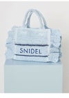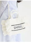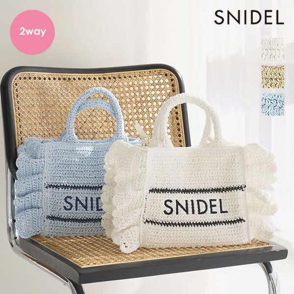 【春夏スタイリングを盛り上げるトレンド感たっぷりのブレーズフリルロゴショルダーバッグ】 定番人気のSNIDELロゴ刺繍入りの華やかなフリルバッグに、春夏シーズンにぴったりな天然素材の柄編みバッグが登場。 こちらはミニバッグ(SWGB261651)より大きめのサイズ感でお作りしており、タンブラーやポーチなどがたっぷりと入ります。 軽やかで涼やかな素材感で、スタイリングを華やかに彩って。 底板を入れているのでしっかりと形状をキープします。 SNIDELロゴは、ネイビーカラーで大きめに刺繍を施し、今季らしいマリンテイストに仕上げました。 付属の長さ調節が可能な細レザーストラップを装着すればショルダーにもできる便利な2WAYデザインです。 開口部はマグネット仕様で中が見えにくく、開けると大きく開口部が開くので整理整頓も楽ちんです。 内側にはカード類が収納できるポケットが付いています。