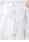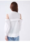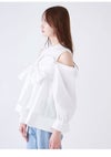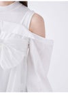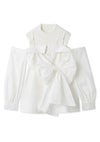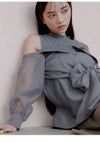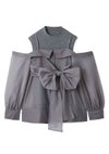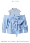 【胸元のリボンが華やかなオフショルデザインシャツとノースリニットトップスのセット】 デザインシャツをボディに巻き付けたような華やかなレイヤードデザインが魅力的なニットトップスです。オフショルデザイン風のチュニック丈のシャツと、コンパクトなプチハイネックのノースリニットのセットで、それぞれ単品でもご着用いただけるデザインです。カラーによりシャツ生地の素材を変えてお作りしています。シャツは、たっぷりとギャザーを寄せた生地を脇から挟み込み、フロント胸下位置でキュッとリボン結びや固結びを作ってご着用いただくこなれ感のあるデザインです。絞り具合は調節可能なので、お好みの美シルエットにてご着用いただけます。オフショル風デザインシャツですが、ショルダーストラップを施しているので安心してご着用いただけます。
