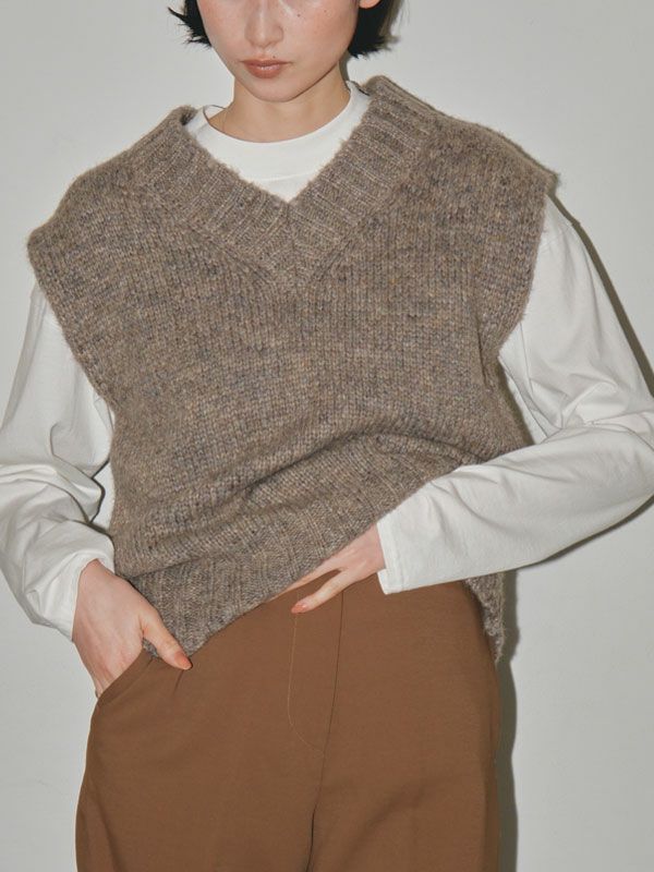 イタリア糸を使用した杢調のニットベスト。 コンパクトなサイズ感とミックスされた糸の風合いが可愛い1枚。 カットソーや、ブラウスなどとのレイヤードがおすすめ。